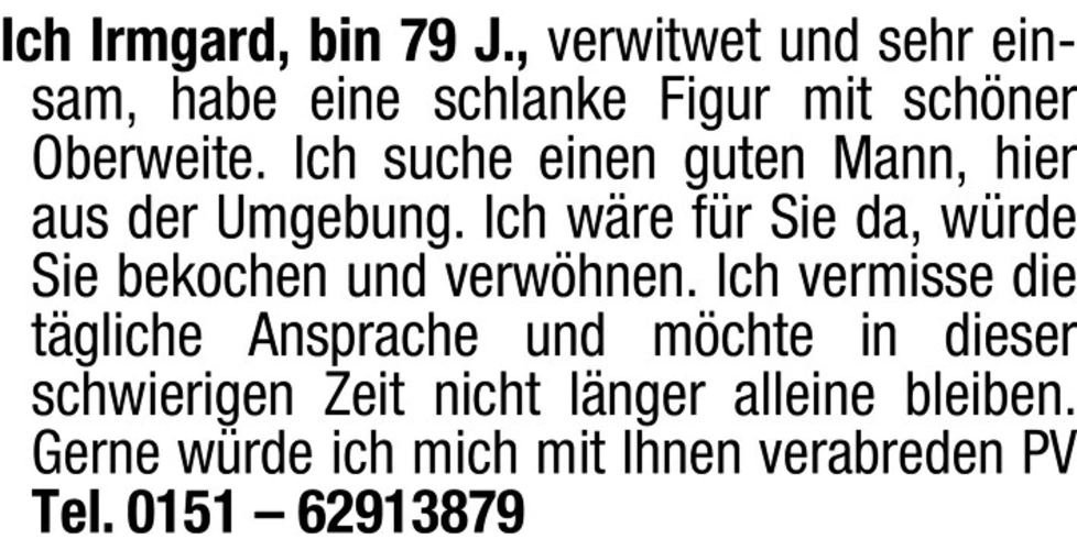 Ich wäre für Sie da, würde Sie bekochen und verwöhnen. Ich vermisse die tägliche Ansprache und möchte in dieser schwierigen Zeit nicht länger alleine bleiben.