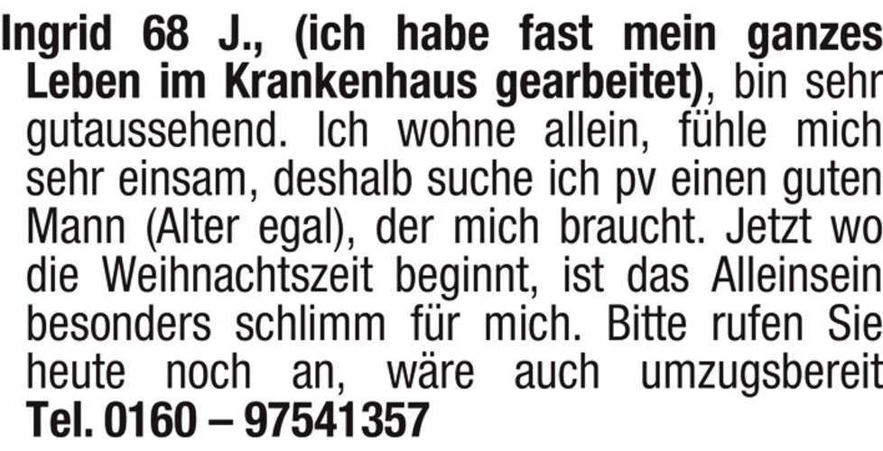 Ingrid 68 J., (ich habe fast mein ganzes Leben im Krankenhaus gearbeitet), bin sehr gutaussehend. Ich wohne allein, fühle mich sehr einsam, deshalb suche ich pv einen guten Mann (Alter egal), der mich braucht. Jetzt wo die Weihnachtszeit beginnt, ist das Alleinsein besonders schlimm für mich. Bitte rufen Sie heute noch an, wäre auch umzugsbereit Tel. 0160 - 97541357