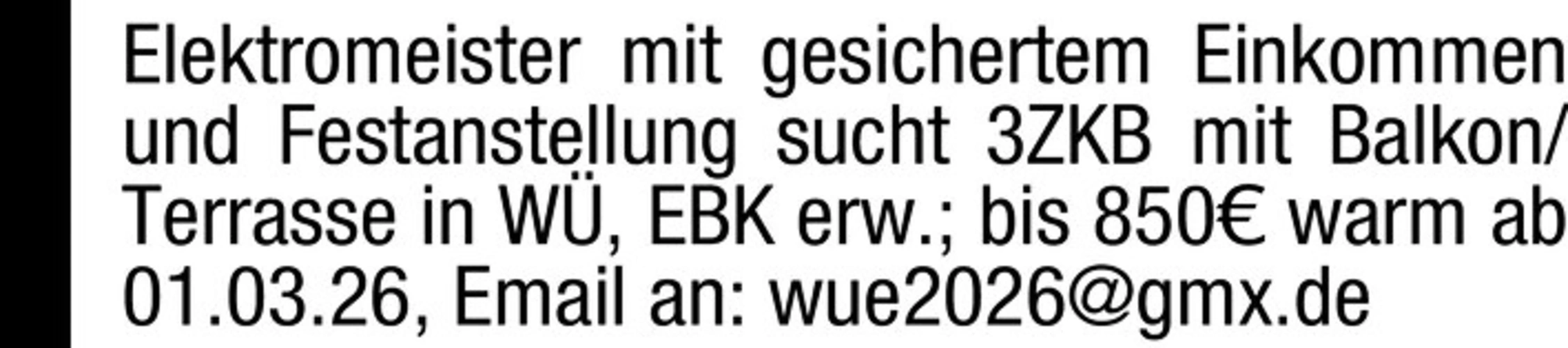 Elektromeister mit gesichertem Einkommen und Festanstellung sucht 3ZKB mit Balkon/Terrasse in W, EBK erw.; bis 850 warm ab 01.03.26, Email an: wue2026@gmx.de