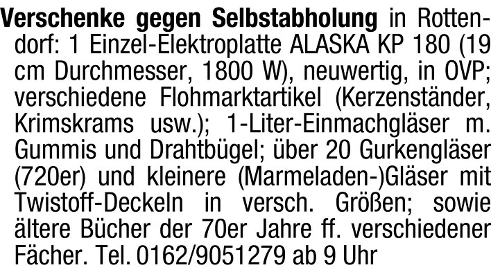Elektroplatte, Einmachgläser, Flohmarktartikel kostenlos in Rottendorf