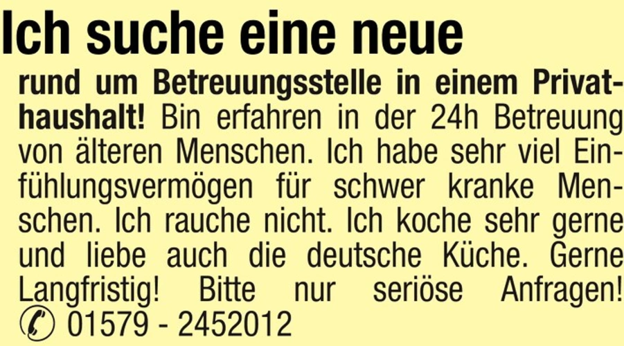 Ich suche eine neue rund um Betreuungsstelle in einem Privathaushalt! Bin erfahren in der 24h Betreuung von lteren Menschen. Ich habe sehr viel Einfhlungsvermgen fr schwer kranke Menschen. Ich rauche nicht. Ich koche sehr gerne und liebe auch die deutsche Kche. Gerne Langfristig! Bitte nur serise Anfragen! 01579 - 2452012