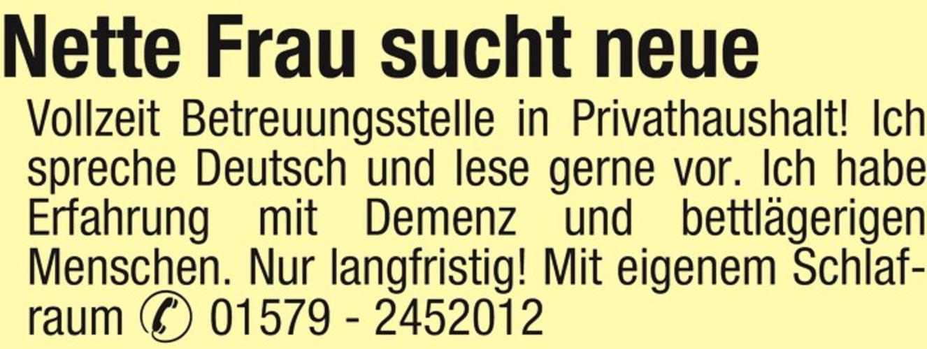 Ich spreche Deutsch und lese gerne vor. Ich habe Erfahrung mit Demenz und bettlägerigen Menschen. Nur langfristig! Mit eigenem Schlafraum 01579 - 2452012