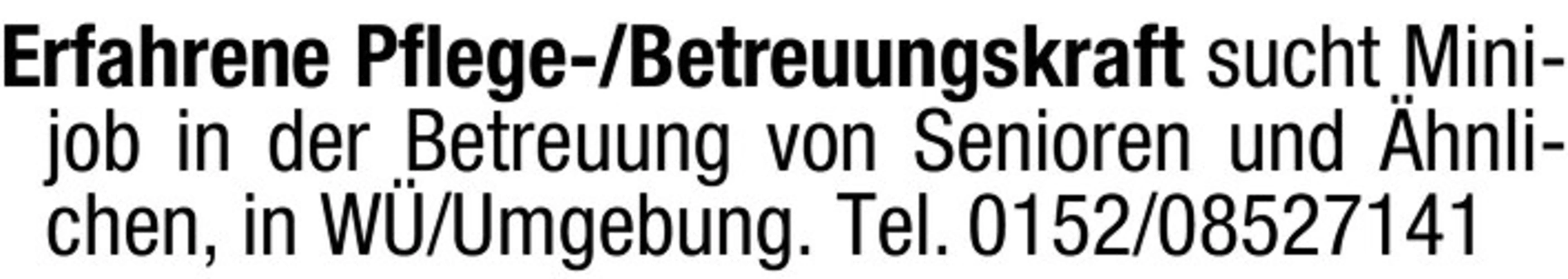 Erfahrene Pflege-/Betreuungskraft sucht Minijob in der Betreuung von Senioren und ähnlichen, in W/Umgebung.
