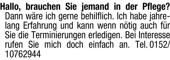 Hallo, brauchen Sie jemand in der Pflege? Dann wre ich gerne behilflich. Ich habe jahrelang Erfahrung und kann wenn ntig auch fr Sie die Terminierungen erledigen. Bei Interesse rufen Sie mich doch einfach an. Tel. 0152/10762944