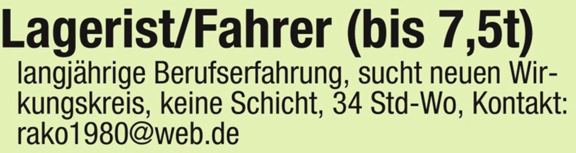 Lagerist/Fahrer (bis 7,5t) langjhrige Berufserfahrung, sucht neuen Wirkungskreis, keine Schicht, 34 Std-Wo, Kontakt: rako1980@web.de