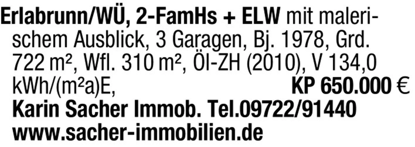 Erlabrunn/W, 2-FamHs ELW mit malerischem Ausblick, 3 Garagen, Bj. 1978, Grd. 722 m, Wfl. 310 m, l-ZH (2010), V 134,0 kWh/(ma)E, KP 650.000 Karin Sacher Immob. Tel.09722/91440www.sacher-immobilien.de