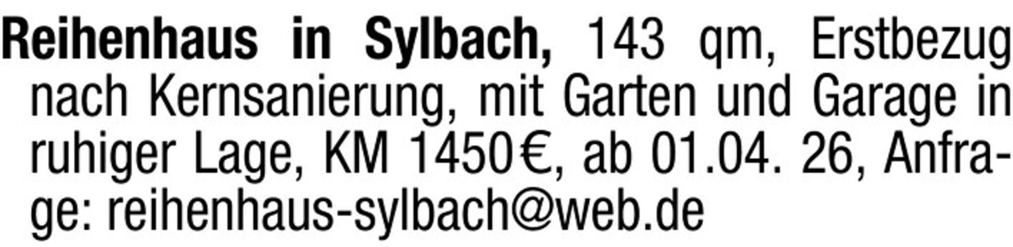 Reihenhaus in Sylbach, 143 qm, Erstbezug nach Kernsanierung, mit Garten und Garage in ruhiger Lage, KM 1450, ab 01.04. 26, Anfrage: reihenhaus-sylbach@web.de