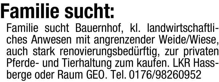 Familie sucht: Familie sucht Bauernhof, kl. landwirtschaftliches Anwesen mit angrenzender Weide/Wiese, auch stark renovierungsbedrftig, zur privaten Pferde- und Tierhaltung zum kaufen. LKR Hassberge oder Raum GEO. Tel.: 0176/98260952
