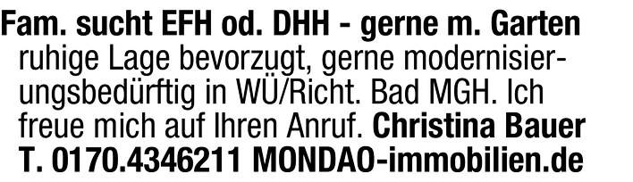 Fam. sucht EFH od. DHH - gerne m. Gartenruhige Lage bevorzugt, gerne modernisier-ungsbedrftig in W/Richt. Bad MGH. Ichfreue mich auf Ihren Anruf. Christina BauerT. 0170.4346211 MONDAO-immobilien.de