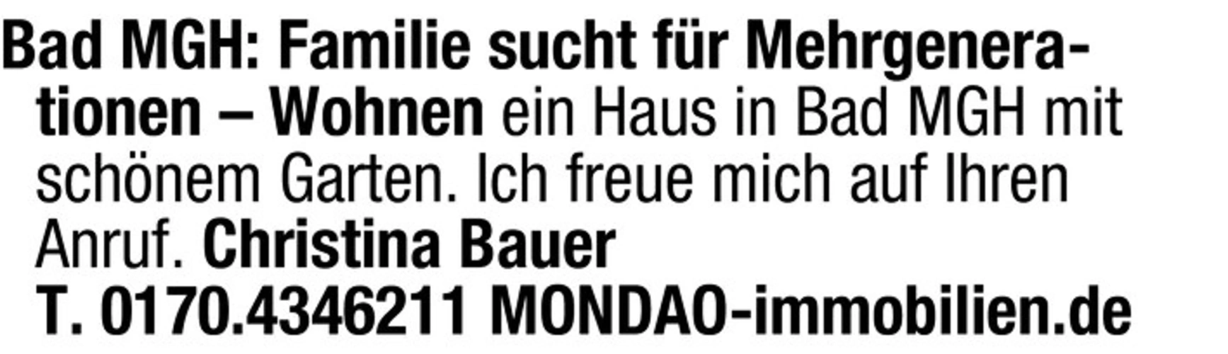 Bad MGH: Familie sucht für Mehrgenerationen-Wohnen ein Haus in Bad MGH mit schönem Garten. Ich freue mich auf Ihren Anruf. Christina Bauer T. 0170.4346211 MONDAO-immobilien.de