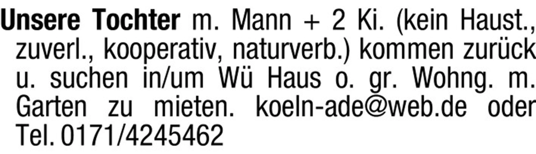 Unsere Tochter m. Mann 2 Ki. (kein Haustier, zuverlässig, kooperativ, naturverbunden) kommen zurück und suchen in/um W Haus oder große Wohnung mit Garten zu mieten.