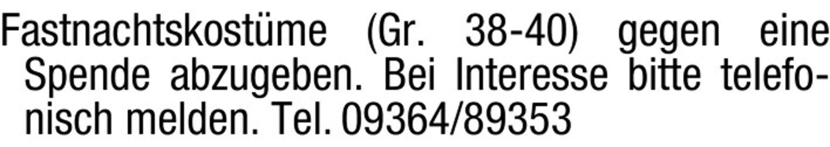 Fastnachtskostme (Gr. 38-40) gegen eine Spende abzugeben. Bei Interesse bitte telefonisch melden. Tel: 09364/89353