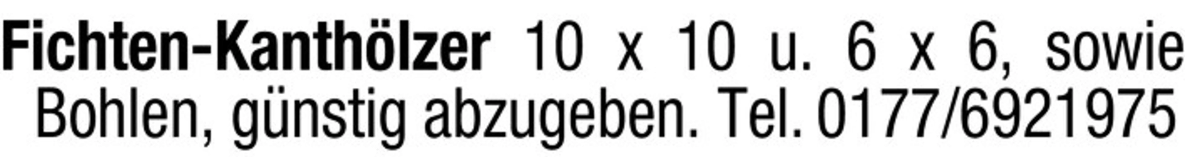 Fichten-Kanthlzer 10 x 10 u. 6 x 6, sowie Bohlen, gnstig abzugeben. Tel. 0177/6921975