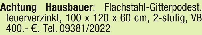 Achtung Hausbauer: Flachstahl-Gitterpodest, feuerverzinkt, 100 x 120 x 60 cm, 2-stufig, VB 400.- . Tel. 09381/2022