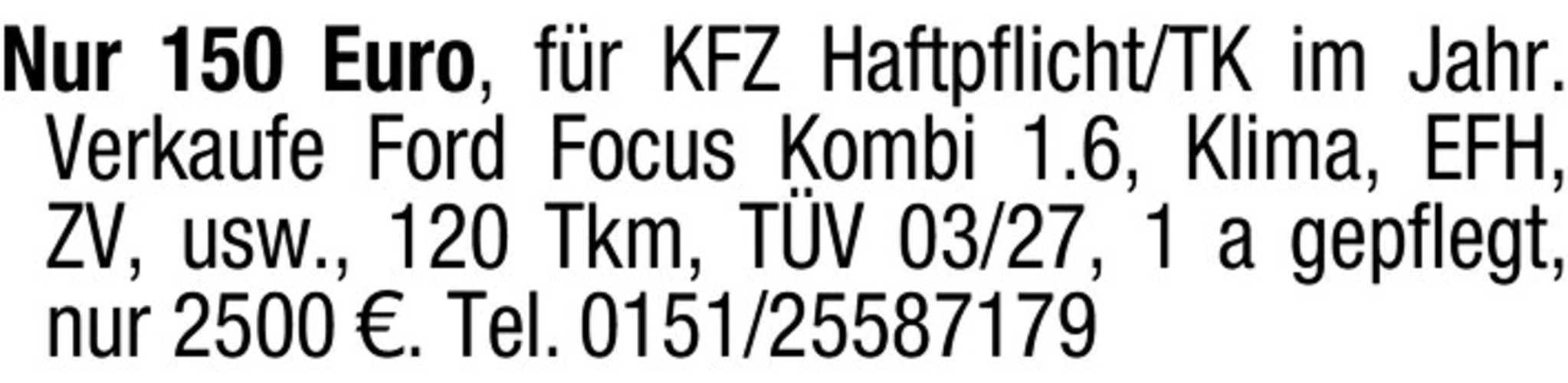 Nur 150 Euro, fr KFZ Haftpflicht/TK im Jahr. Verkaufe Ford Focus Kombi 1.6, Klima, EFH, ZV, usw., 120 Tkm, TV 03/27, 1 a gepflegt, nur 2500 . Tel. 0151/25587179