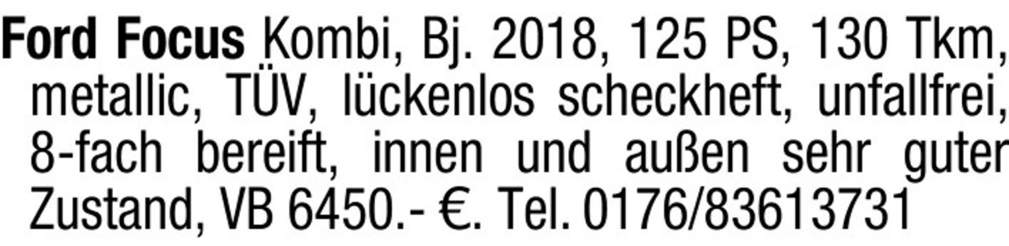 Ford Focus Kombi, Bj. 2018, 125 PS, 130 Tkm, metallic, TV, lckenlos scheckheft, unfallfrei, 8-fach bereift, innen und auen sehr guter Zustand, VB 6450.- . Tel. 0176/83613731