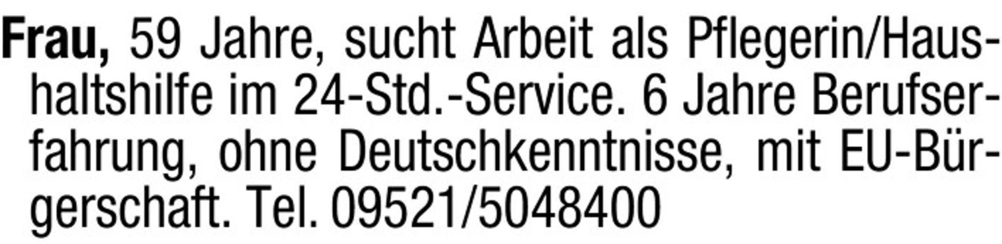 Frau, 59 Jahre, sucht Arbeit als Pflegerin/Haushaltshilfe im 24-Std.-Service. 6 Jahre Berufserfahrung, ohne Deutschkenntnisse, mit EU-Brgerschaft. Tel. 09521/5048400