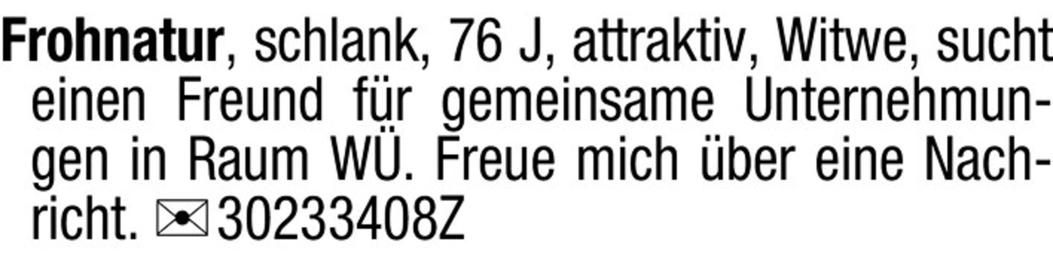 Frohnatur, schlank, 76 J, attraktiv, Witwe, sucht einen Freund fr gemeinsame Unternehmungen in Raum W. Freue mich ber eine Nachricht. Chiffre 30233408