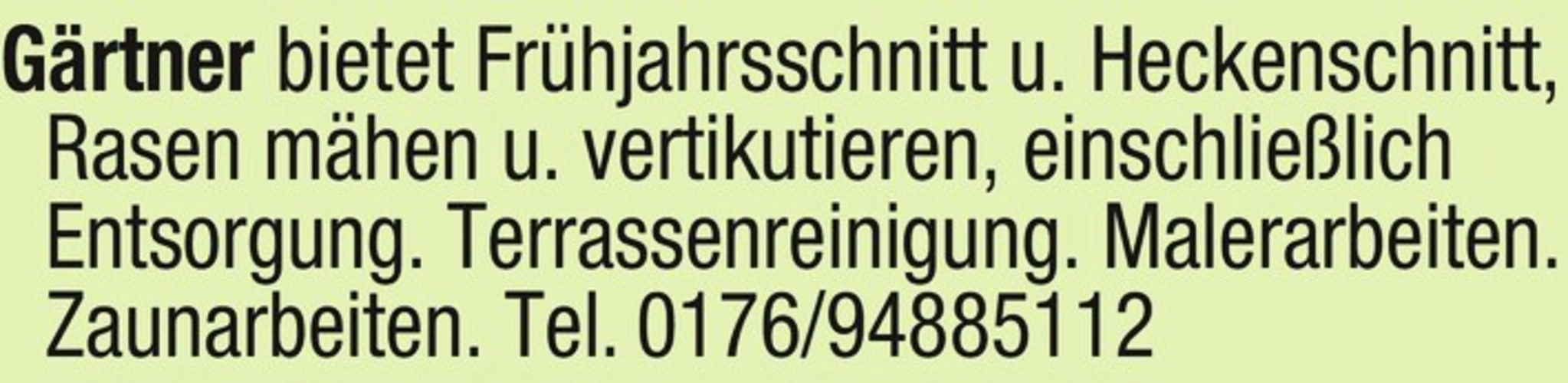Grtner bietet Frhjahrsschnitt u. Heckenschnitt, Rasen mhen u. vertikutieren, einschlielich Entsorgung. Terrassenreinigung. Malerarbeiten. Zaunarbeiten. Tel. 0176/94885112
