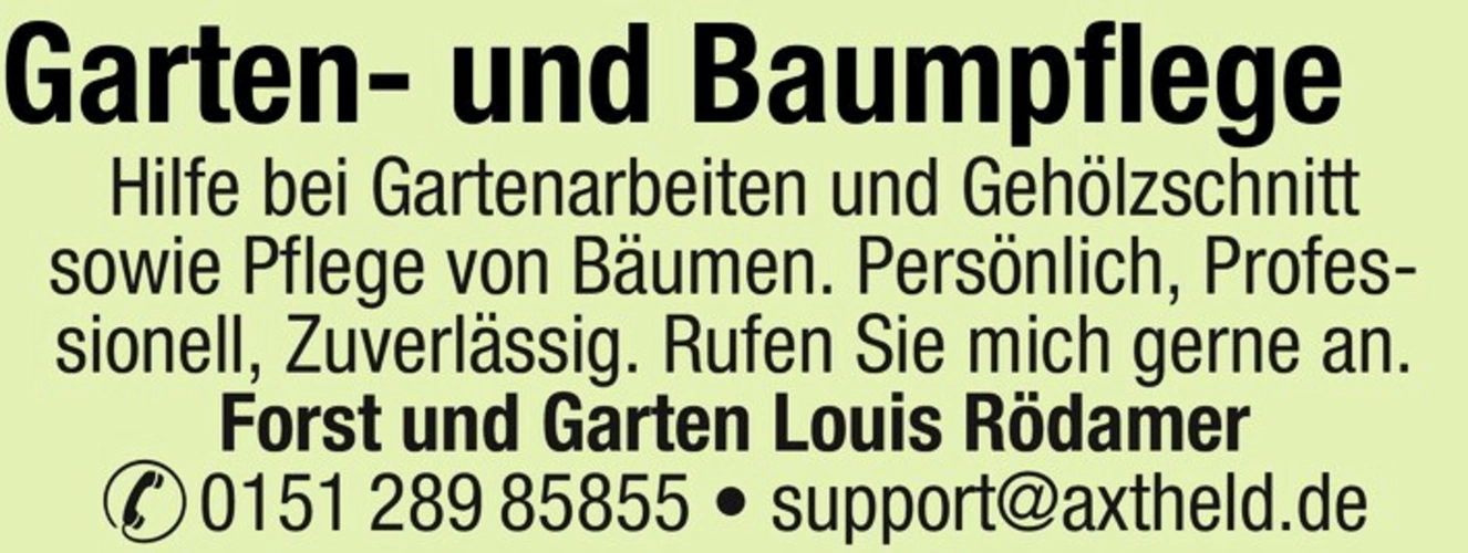 Garten- und Baumpflege Hilfe bei Gartenarbeiten und Gehlzschnitt sowie Pflege von Bumen. Persnlich, Professionell, Zuverlssig. Rufen Sie mich gerne an.Forst und Garten Louis Rdamer 0151 289 85855 support@axtheld.de