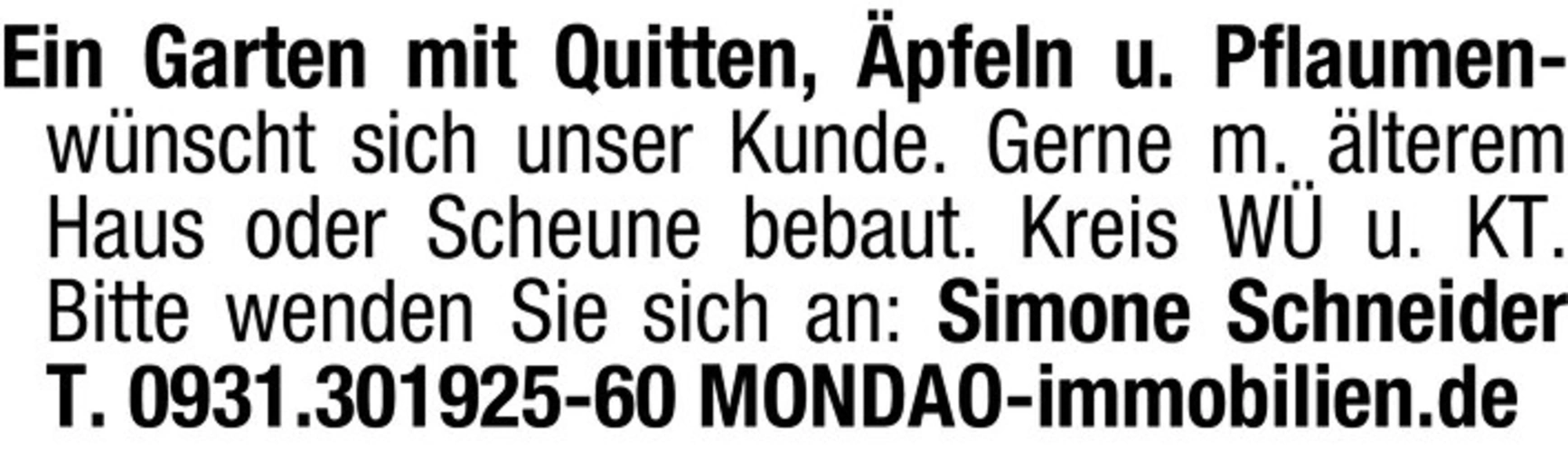 Ein Garten mit Quitten, Äpfeln und Pflaumen - wünscht sich unser Kunde. Gerne mit älterem Haus oder Scheune bebaut.