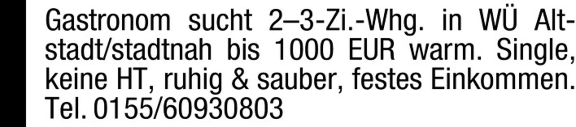 Gastronom sucht 2-3-Zi.-Whg. in W Altstadt/stadtnah bis 1000 EUR warm. Single, keine HT, ruhig & sauber, festes Einkommen. Tel. 0155/60930803