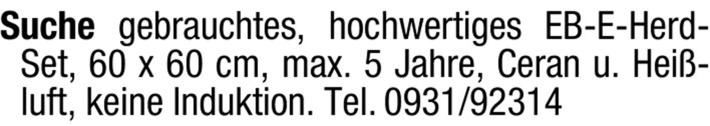 Suche gebrauchtes, hochwertiges EB-E-Herd-Set, 60 x 60 cm, max. 5 Jahre, Ceran u. Heiluft, keine Induktion. Tel. 0931/92314