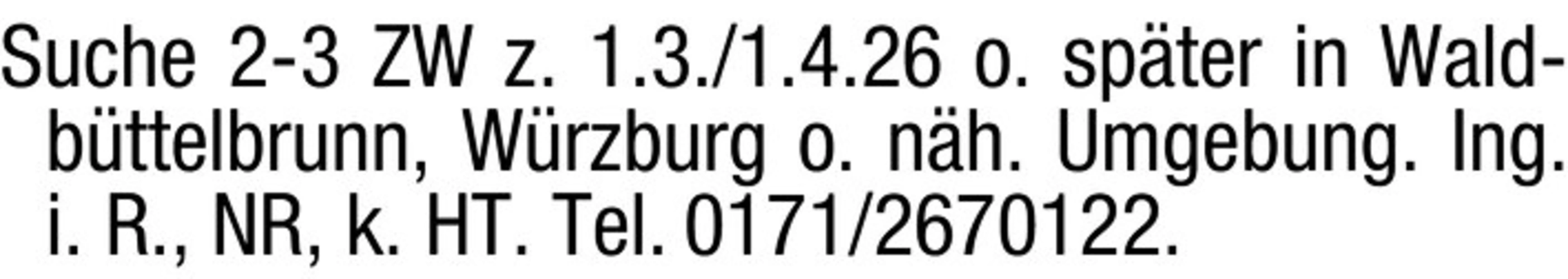 Suche 2-3 ZW z. 1.3./1.4.26 o. spter in Waldbttelbrunn, Wrzburg o. nh. Umgebung. Ing. i. R., NR, k. HT. Tel. 0171/2670122.