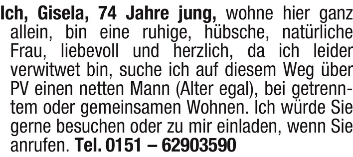 Ich, Gisela, 74 Jahre jung, wohne hier ganz allein, bin eine ruhige, hbsche, natrliche Frau, liebevoll und herzlich, da ich leider verwitwet bin, suche ich auf diesem Weg ber PV einen netten Mann (Alter egal), bei getrenntem oder gemeinsamen Wohnen. Ich wrde Sie gerne besuchen oder zu mir einladen, wenn Sie anrufen.