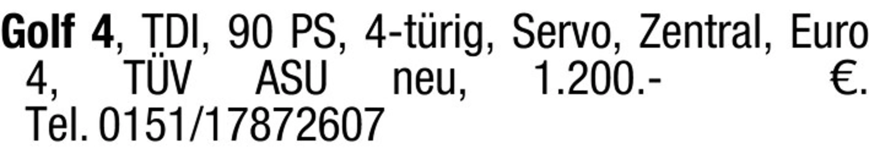 text Golf 4, TDI, 90 PS, 4-trig, Servo, Zentral, Euro 4, TV ASU neu, 1.200.- . Tel. 0151/17872607