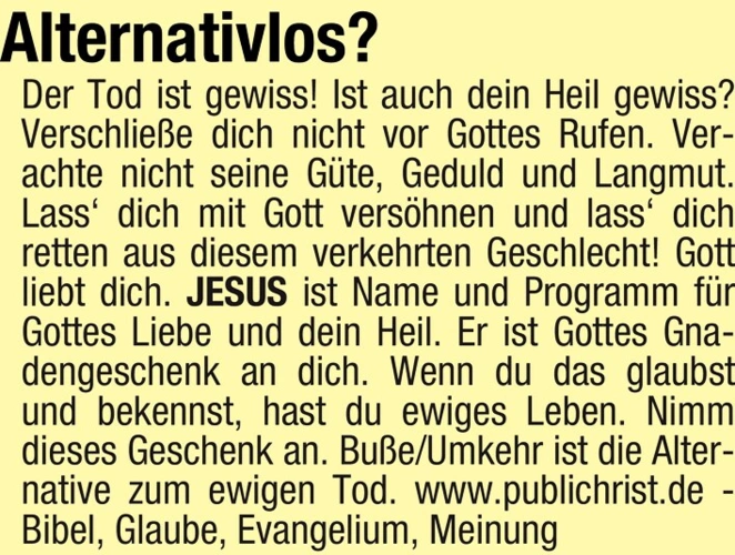 Alternativlos? Der Tod ist gewiss! Ist auch dein Heil gewiss?