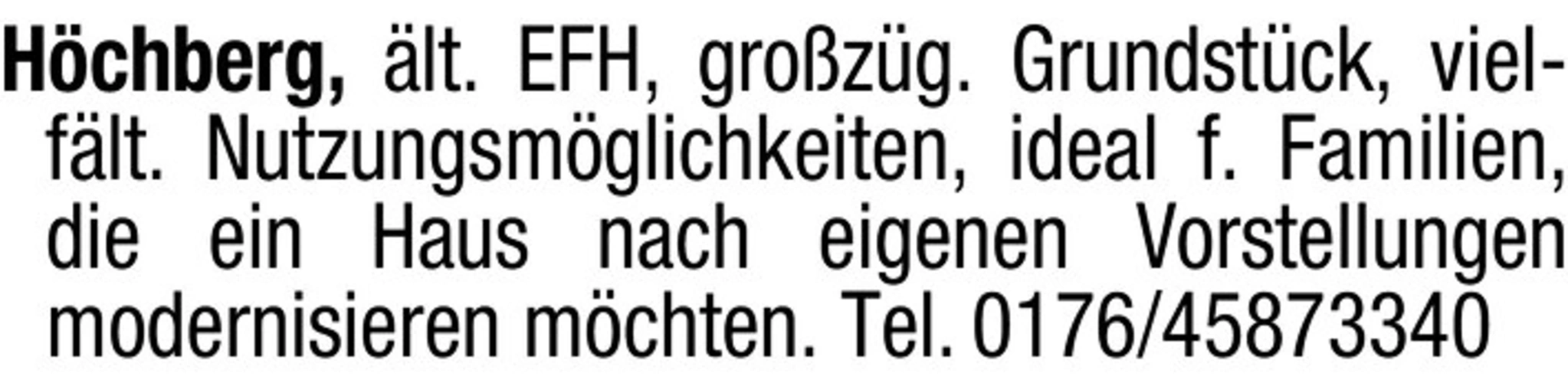 Hchberg, lt. EFH, grozg. Grundstck, vielflt. Nutzungsmglichkeiten, ideal f. Familien, die ein Haus nach eigenen Vorstellungen modernisieren mchten. Tel. 0176/45873340