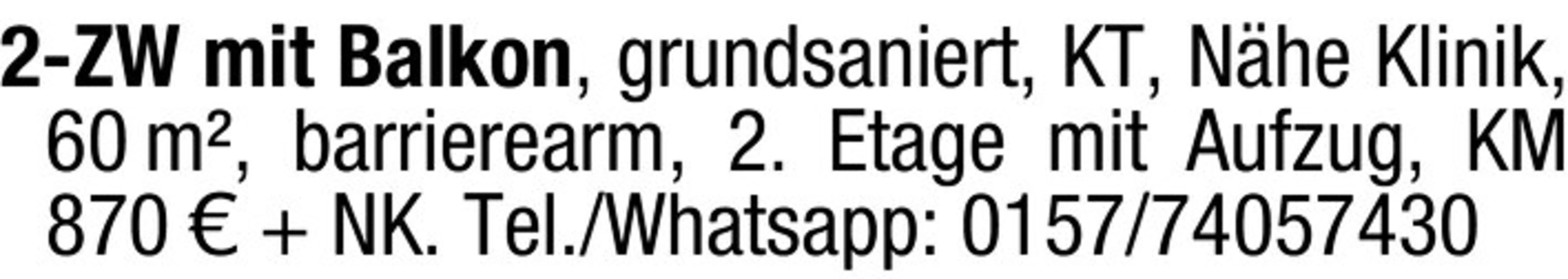 markdown 2-ZW mit Balkon, grundsaniert, KT, Nhe Klinik, 60 m, barrierearm, 2. Etage mit Aufzug, KM 870 NK. Tel./Whatsapp: 0157/74057430