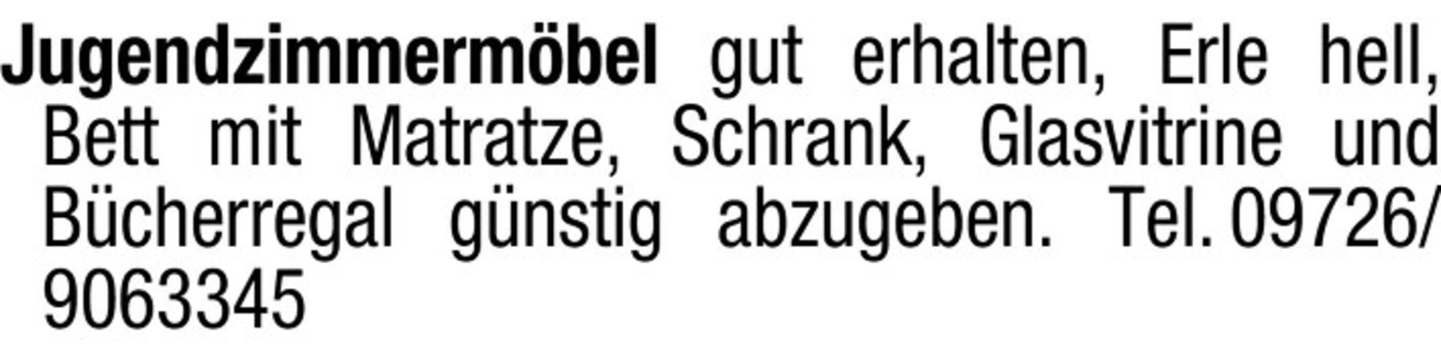 Jugendzimmermbel gut erhalten, Erle hell, Bett mit Matratze, Schrank, Glasvitrine und Bcherregal gnstig abzugeben. Tel. 09726/9063345