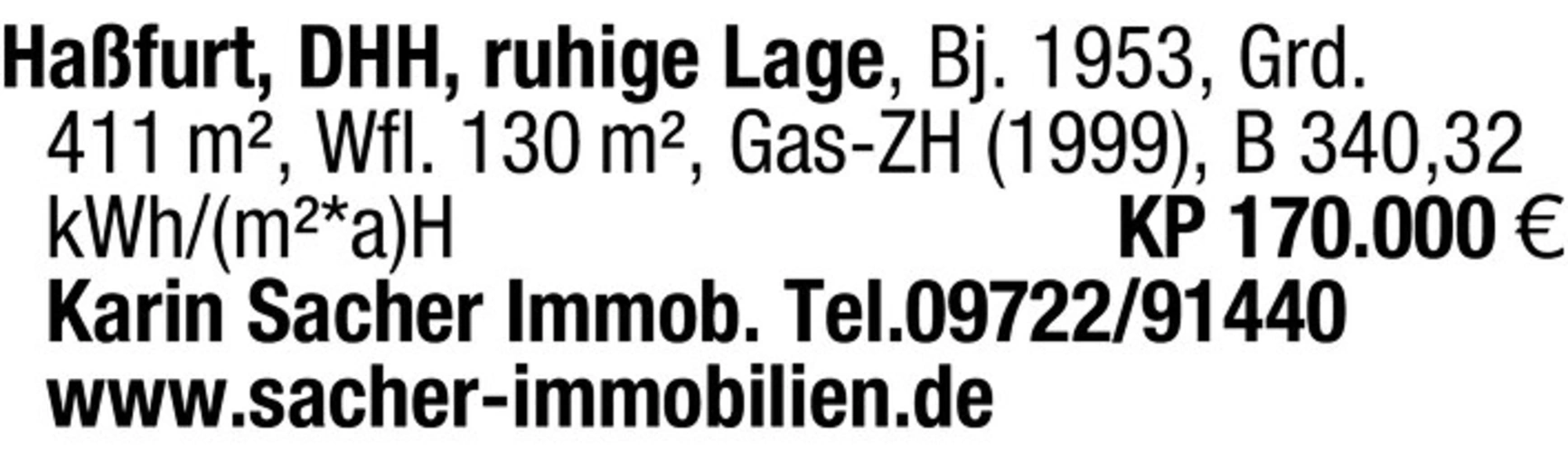 Hafurt, DHH, ruhige Lage, Bj. 1953, Grd. 411 m, Wfl. 130 m, Gas-ZH (1999), B 340,32 kWh/(m*a)H KP 170.000 Karin Sacher Immob. Tel.09722/91440www.sacher-immobilien.de