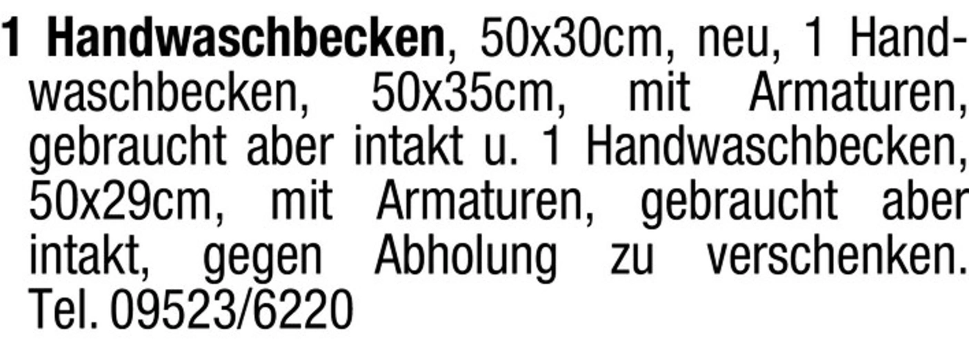 • 1 Handwaschbecken: 50x29cm, mit Armaturen, gebraucht aber intakt, gegen Abholung zu verschenken.