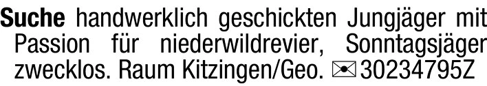 Suche handwerklich geschickten Jungjäger mit Passion für Niederwildrevier, Sonntagsjäger zwecklos. Raum Kitzingen/Gerolzhofen. Chiffre 30234795