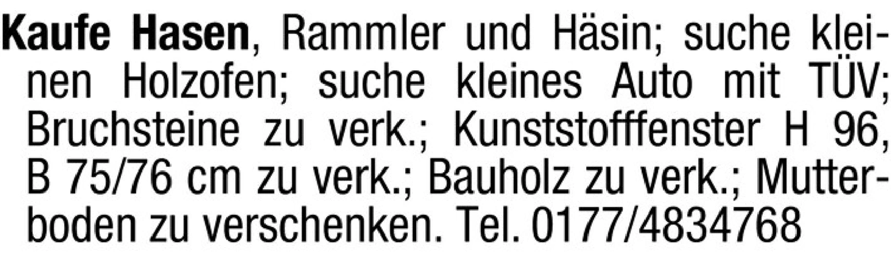 Hasen, Holzofen, Auto und Baustellenmaterial gesucht