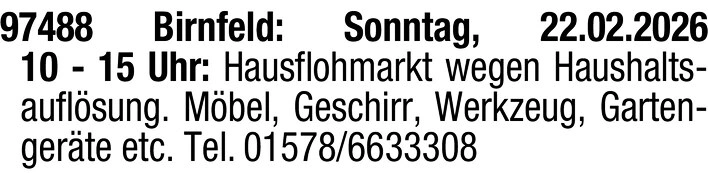 Hausflohmarkt Birnfeld - Haushaltsauflösung 22.02.