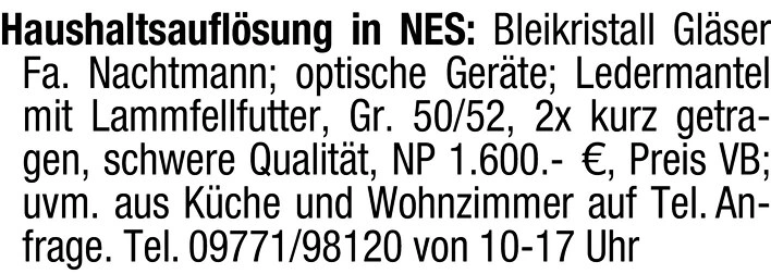 Haushaltsauflösung NES: Bleikristall, Ledermantel, Küche