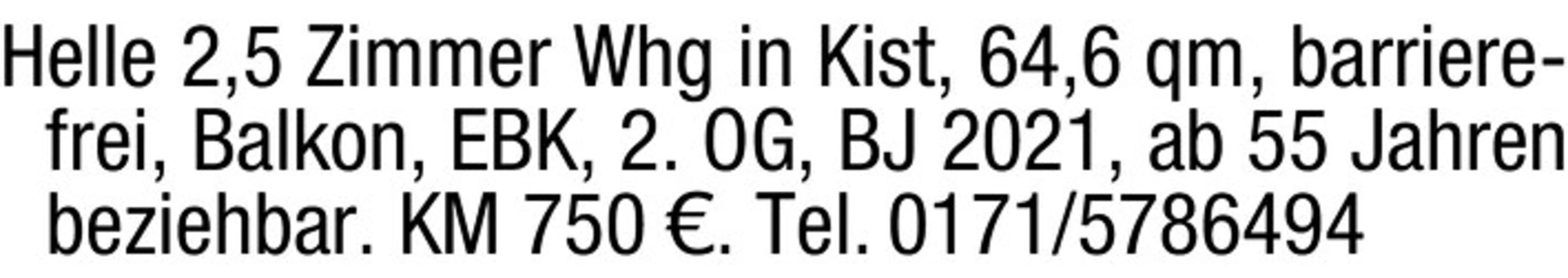 Helle 2,5 Zimmer Whg in Kist, 64,6 qm, barrierefrei, Balkon, EBK, 2. OG, BJ 2021, ab 55 Jahren beziehbar. KM 750 . Tel. 0171/5786494