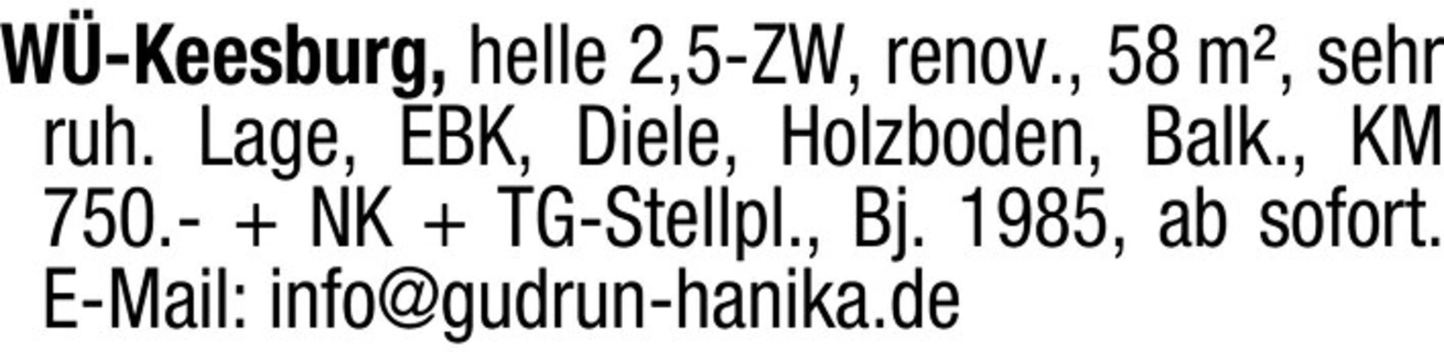 W-Keesburg, helle 2,5-ZW, renov., 58 m, sehr ruh. Lage, EBK, Diele, Holzboden, Balk., KM 750.- NK TG-Stellpl., Bj. 1985, ab sofort. E-Mail: info@gudrun-hanika.de