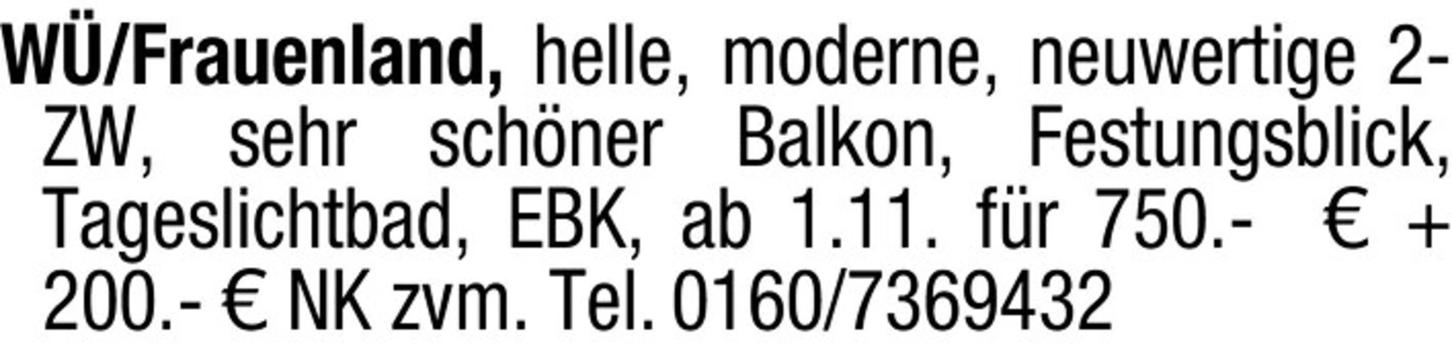 W/Frauenland, helle, moderne, neuwertige 2-ZW, sehr schöner Balkon, Festungsblick, Tageslichtbad, EBK, ab 1.11. für 750.- 200.- NK zvm. Tel. 0160/7369432