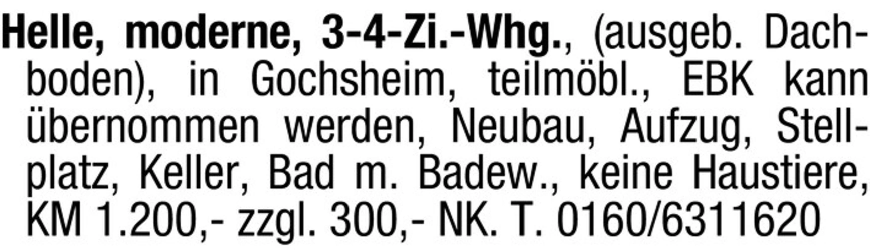 Helle, moderne, 3-4-Zi.-Whg., (ausgebauter Dachboden), in Gochsheim, teilmbl., EBK kann bernommen werden, Neubau, Aufzug, Stellplatz, Keller, Bad m. Badew., keine Haustiere, KM 1.200,- zzgl. 300,- NK. Tel. 0160/6311620