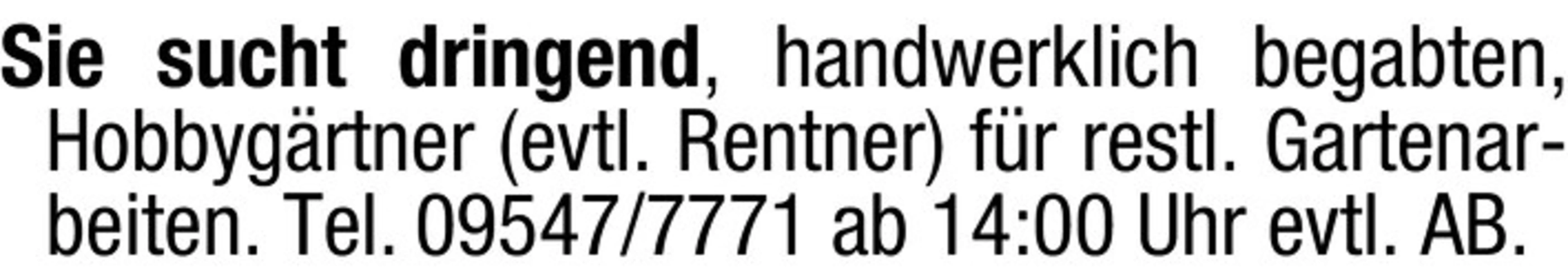 Sie sucht dringend, handwerklich begabten, Hobbygärtner (evtl. Rentner) für restl. Gartenarbeiten.