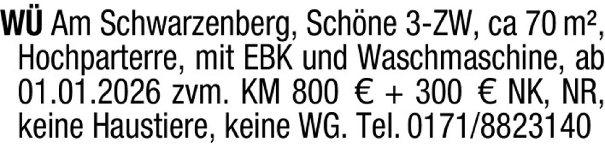 W Am Schwarzenberg, Schne 3-ZW, ca 70 m², Hochparterre, mit EBK und Waschmaschine, ab 01.01.2026 zvm.