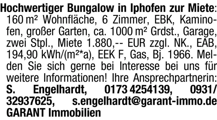 Hochwertiger Bungalow in Iphofen zur Miete: 160 m Wohnflche, 6 Zimmer, EBK, Kaminofen, groer Garten, ca. 1000 m Grdst., Garage, zwei Stpl., Miete 1.880,- EUR zzgl. NK., EAB, 194,90 kWh/(m*a), EEK F, Gas, Bj. 1966. Melden Sie sich gerne bei Interesse bei uns fr weitere Informationen! Ihre Ansprechpartnerin: S. Engelhardt, 0173 4254139, 0931/32937625, s.engelhardt@garant-immo.de GARANT Immobilien