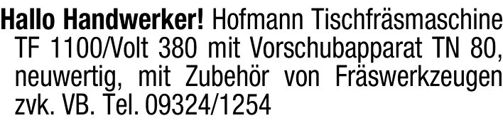Hallo Handwerker! Hofmann Tischfrsmaschine TF 1100/Volt 380 mit Vorschubapparat TN 80, neuwertig, mit Zubehr von Frswerkzeugen zvk. VB. Tel. 09324/1254