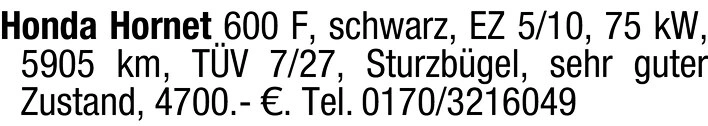 Honda Hornet 600 F schwarz, 75 kW, 5905 km, 4700 Euro