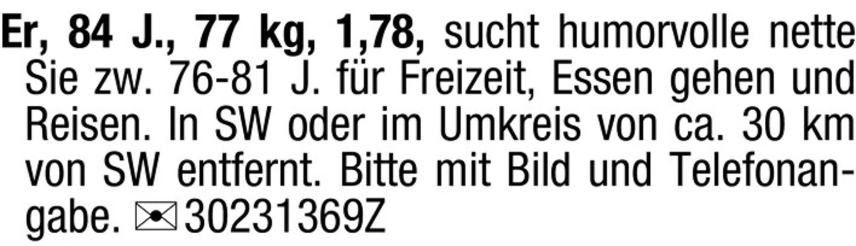 Er, 84 J., 77 kg, 1,78, sucht humorvolle nette Sie zw. 76-81 J. fr Freizeit, Essen gehen und Reisen. In SW oder im Umkreis von ca. 30 km von SW entfernt. Bitte mit Bild und Telefonangabe. Chiffre 30231369
